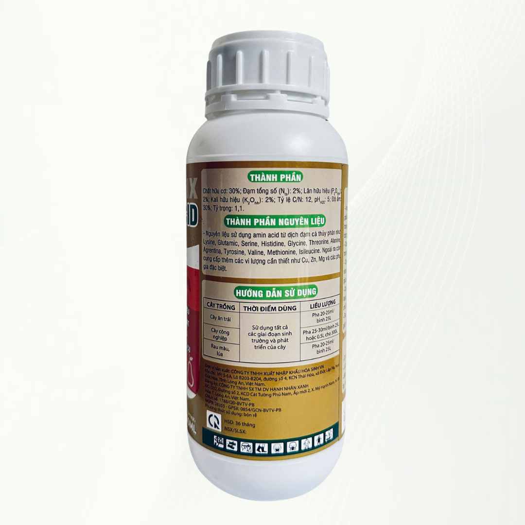 Amino Hữu Cơ là loại phân vi lượng, cung cấp các thành phần dinh dưỡng đặc biệt như: Acid amin từ dịch đạm thủy phân và lượng giúp cây tăng trưởng và phát triển mạnh trong các giai đoạn sinh trưởng.