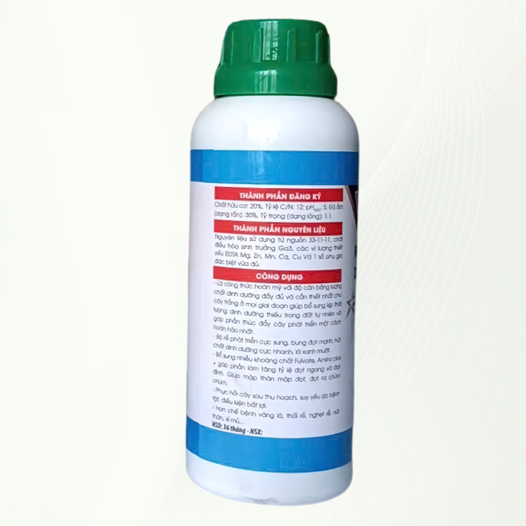 Nguyên liệu: GA₃ (chất điều hòa sinh trưởng), vi lượng EDTA Mg, Zn, Mn, Ca, Cu, khoáng chất Fulvate, Amino Plus và phụ gia đặc biệt.